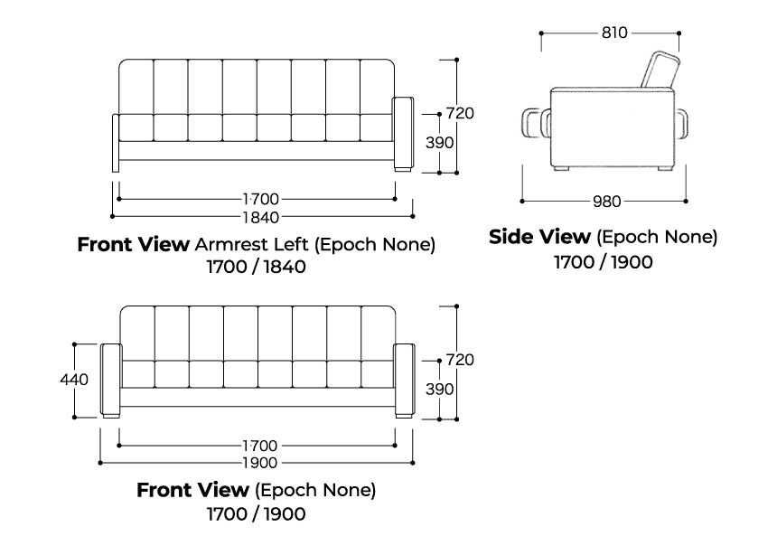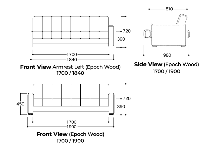 | Notes | 8 sizes in increments of 100mm available with wood and non-wood armrest options. Can convert into a bed against the wall. |