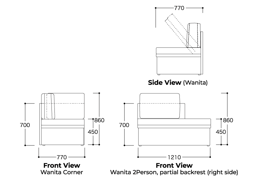 | Notes | Choose from 5 sizes in Puria. Wanita has storage space under the seat (corner W580×D660×H250, W1020×D660×H250) |